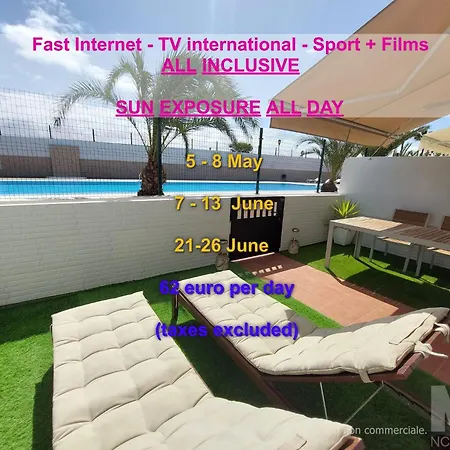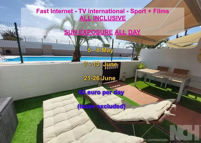 A medencére néző terasszal rendelkező 1 hálószobás Sabai Holiday Home Corralejo 40 perces autóútra fekszik a Fuerteventura repülőtértől.